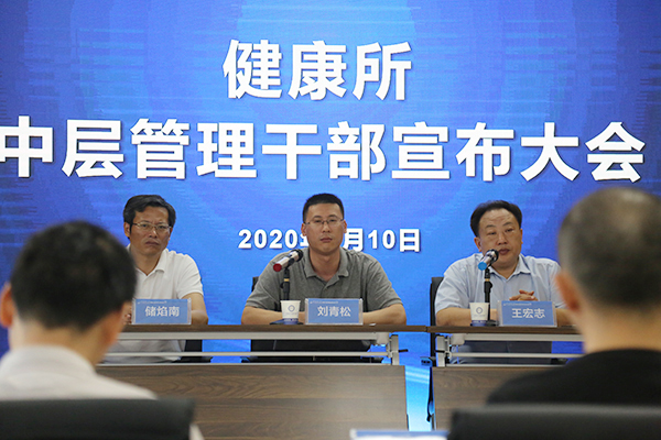 所长刘青松在会上讲话。他指出,健康所作为合肥研究院内最“年轻”的科研单元,既充满活力但也面临着诸多挑战,本次新任命的管理干部勇于承担研究所发展的责任和使命,他深表感谢。希望健康所全体管理干部和职工要精诚团结,不断吸引优秀人才,壮大科研队伍;发挥成建制的发展策略,集中优势资源,打造有影响力的团队;围绕健康所四大中心方向,用扎实的研究做出高水平的科研成果;充分利用好中科院合肥肿瘤医院的临床医疗资源,把研究工作和医疗工作紧密结合,走出中国转化医学发展的新路子。他相信,只要大家团结一心,一定能把健康所建设成为全国一流的特色新医学科研单位。
