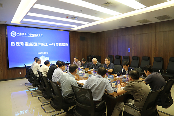 中科院合肥研究院健康所所长刘青松,健康所党委书记、中国科学院合肥肿瘤医院院长王宏志,肿瘤医院执行院长高世明等接待赵国屏院士一行。在医院新院区行政楼展厅,王宏志代表医院向来访人员介绍了医院与健康所医研融合的发展理念、中科院特色管理体系及单病种多学科创新诊疗模式,得到了赵国屏院士的充分肯定。
