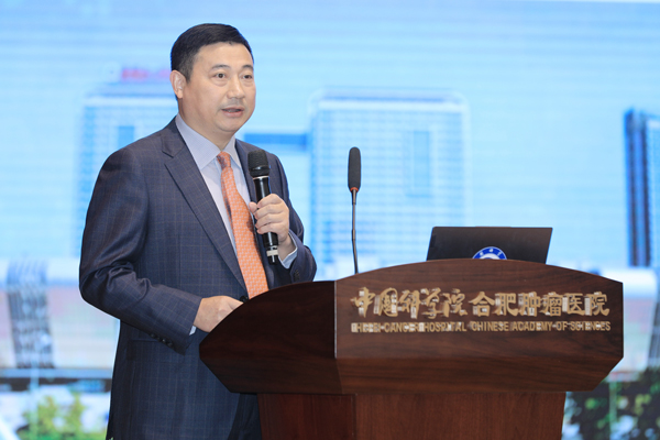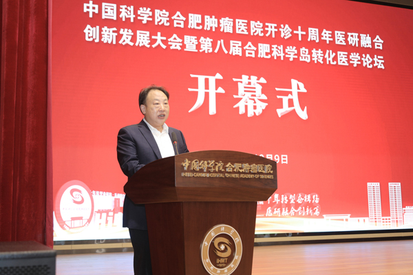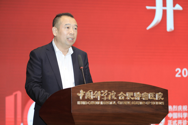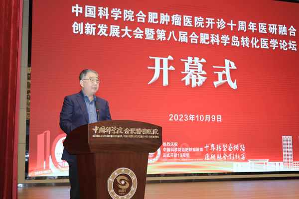 中国科学院合肥物质院院长刘建国在开幕式上讲话,党的二十大报告把推进健康中国建设、保障人民生命健康放在优先发展的战略位置,合肥物质院高度重视健康科技发展,在一些领域有着长期深入系统的研究和积累。早在“十二五”期间,合肥物质院就整合了科学岛内相关资源对健康医学研究领域进行布局,并将原职工医院转型升级为肿瘤专科医院,配套建设临床转化平台,面向合肥物质院乃至整个中国科学院系统开展医学转化研究;2016年,中国科学院正式将该医院命名为“中国科学院合肥肿瘤医院”;2020年,合肥物质院成立了“健康与医学技术研究所”,以进一步推动转化医学发展,同时将肿瘤医院设置为物质院直属机构,与健康所一体化融合发展。今天,恰逢肿瘤医院开诊10周年,一座现代化的新院区已初具规模,希望健康所和肿瘤医院进一步增强使命感、责任感、紧迫感,准确把握“国家队”“国家人”内涵,强化“国家事”、“国家责”的使命担当,认真落实好合肥物质院健康领域科技布局相关要求,深入推进临床与科研深度融合,推动健康所和肿瘤医院一体化高质量发展,开创具有科学岛特色的医研融合新局面,为健康中国建设贡献科学岛力量。