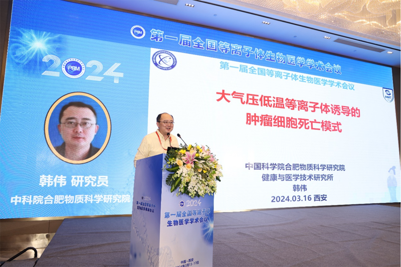 近日,中国科学院合肥物质院健康与医学技术研究所基础医学中心韩伟研究员应邀参加第一届全国等离子体生物医学学术会议(2024年3月15日-18日,西安),并以《大气压低温等离子体诱导的肿瘤细胞死亡模式》为主题作大会主旨报告。