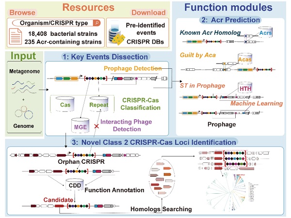CRISPRimmunity是一个全新的、用户界面友好的网络服务器,旨在提供面向CRISPR的一站式综合分析服务平台,全面注释CRISPR-Cas系统与Anit-CRISPR系统共进化过程中关键分子事件,准确预测Anti-CRISPR蛋白,从头识别新型II类CRISPR-Cas基因座,基于CRISPR阵列信息预测细菌与可移动元件(噬菌体、质粒)之间的相互作用,从更加综合地进化视角理解CRISPR-Cas系统和anti-CRISPR系统。