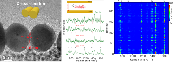 图. 左:激光重构金纳米棒横截面透射电镜图;中:单分子扩散行为检测与分析结果;右:4 min内的结晶紫分子的SERS-mapping结果