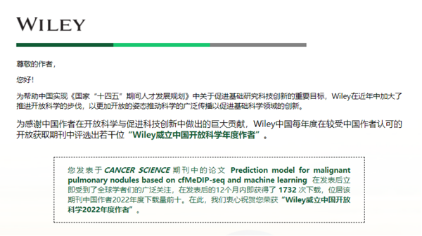 近期,中国科学院合肥肿瘤医院肿瘤转化医学研究中心团队2021年发表于CANCER SCIENCE 期刊的论文 “Prediction model for malignant pulmonary nodules based on cfMeDIP-seq and machine learning”在发表后的12个月内获得了 1732 次下载,位居CANCER SCIENCE 期刊中国作者2022年度下载量前十,论文作者获得了“Wiley威立中国开放科学2022年度作者”。