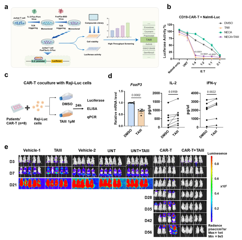体外研究表明,TAIII可逆转A2AR激活介导的免疫抑制,显著降低CAR-T制剂中CAR-Tregs的比例,并有效增强CAR-T细胞对肿瘤细胞杀伤效能。在多种淋巴瘤异种移植模型中,TAIII与CAR-T联合治疗可显著抑制肿瘤生长、有效降低治疗后复发风险并延长小鼠生存期。此外,体外采用TAIII预处理CAR-T细胞,同样可增强其抗肿瘤活性。该增效作用在复发难治性B细胞恶性肿瘤患者来源的CAR-T产品中也得到了验证。